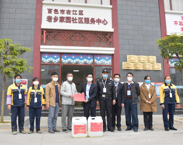 右江區(qū)總工會領(lǐng)導向老鄉(xiāng)家園-迎龍安置小鎮(zhèn)服務(wù)企業(yè)益眾物業(yè)公司捐贈防疫物資